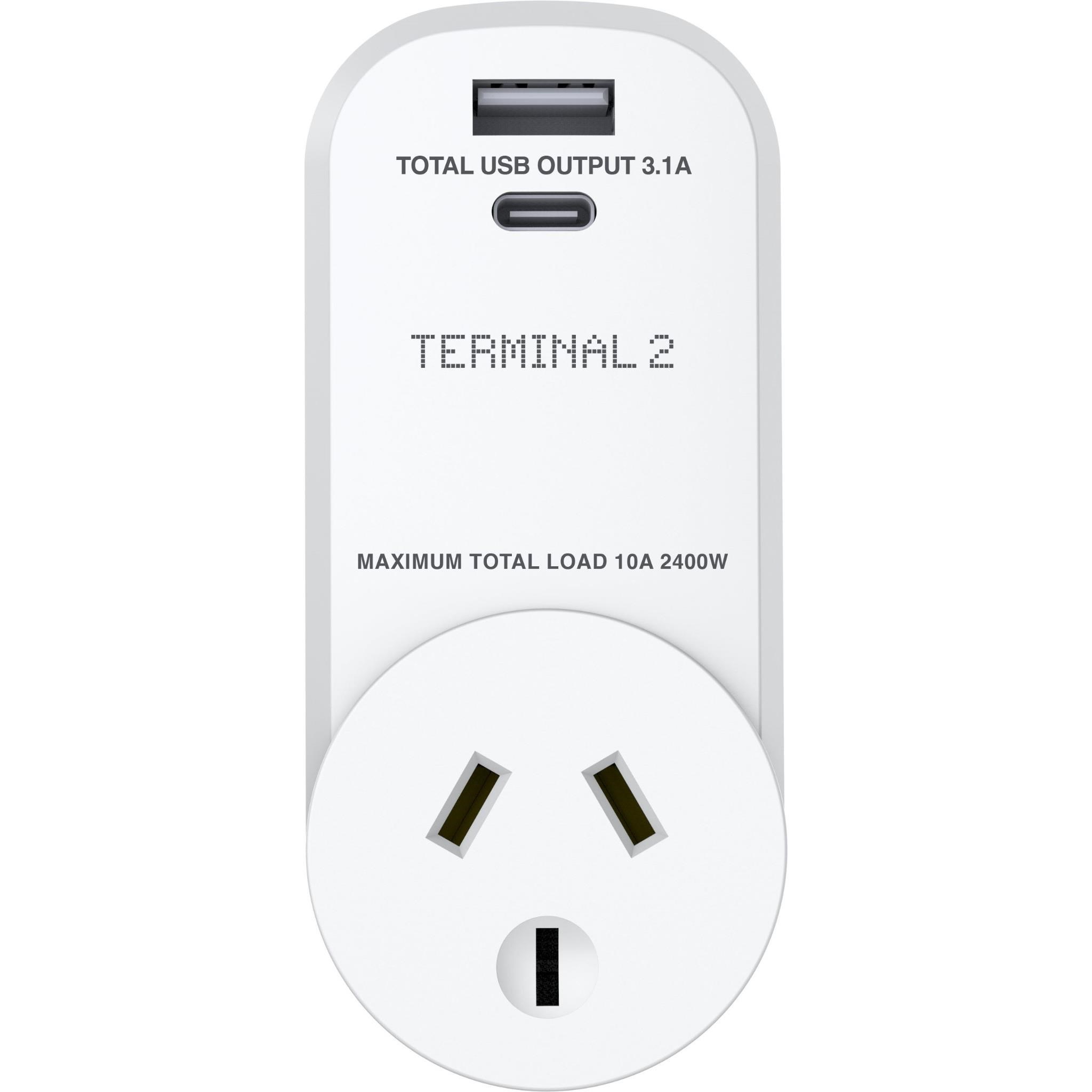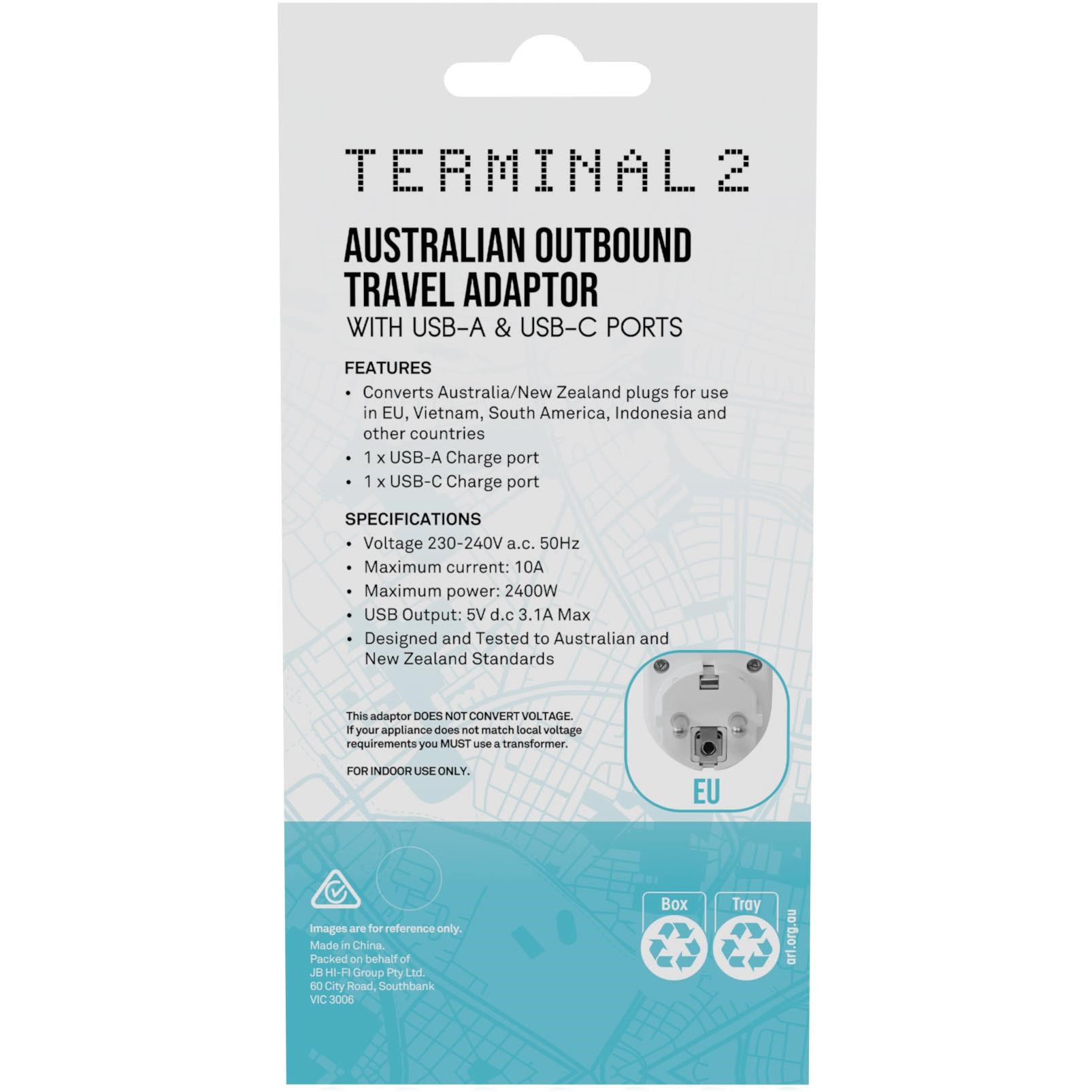 Terminal 2 Outbound Travel Adaptor with USB-A and USB-C Ports Europe