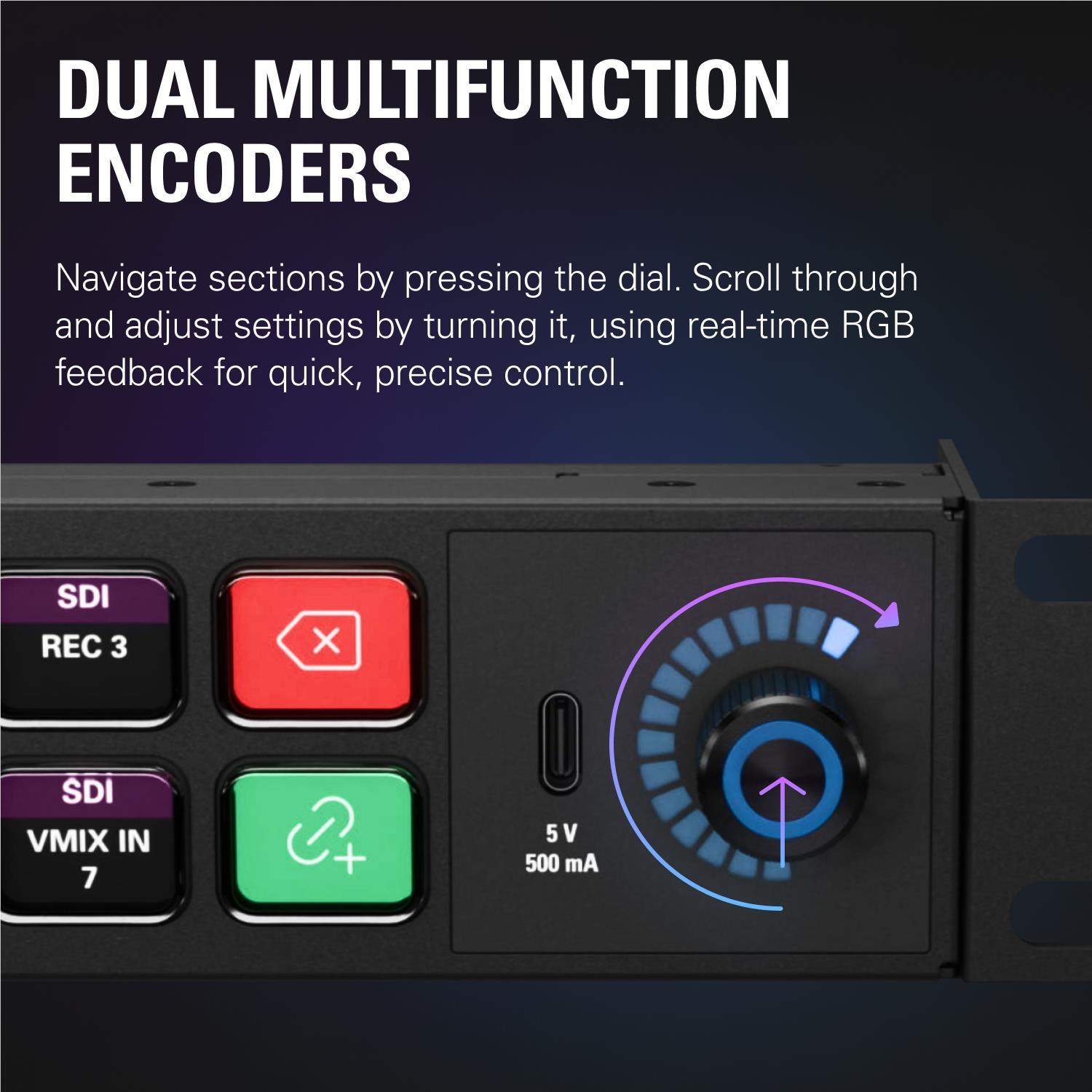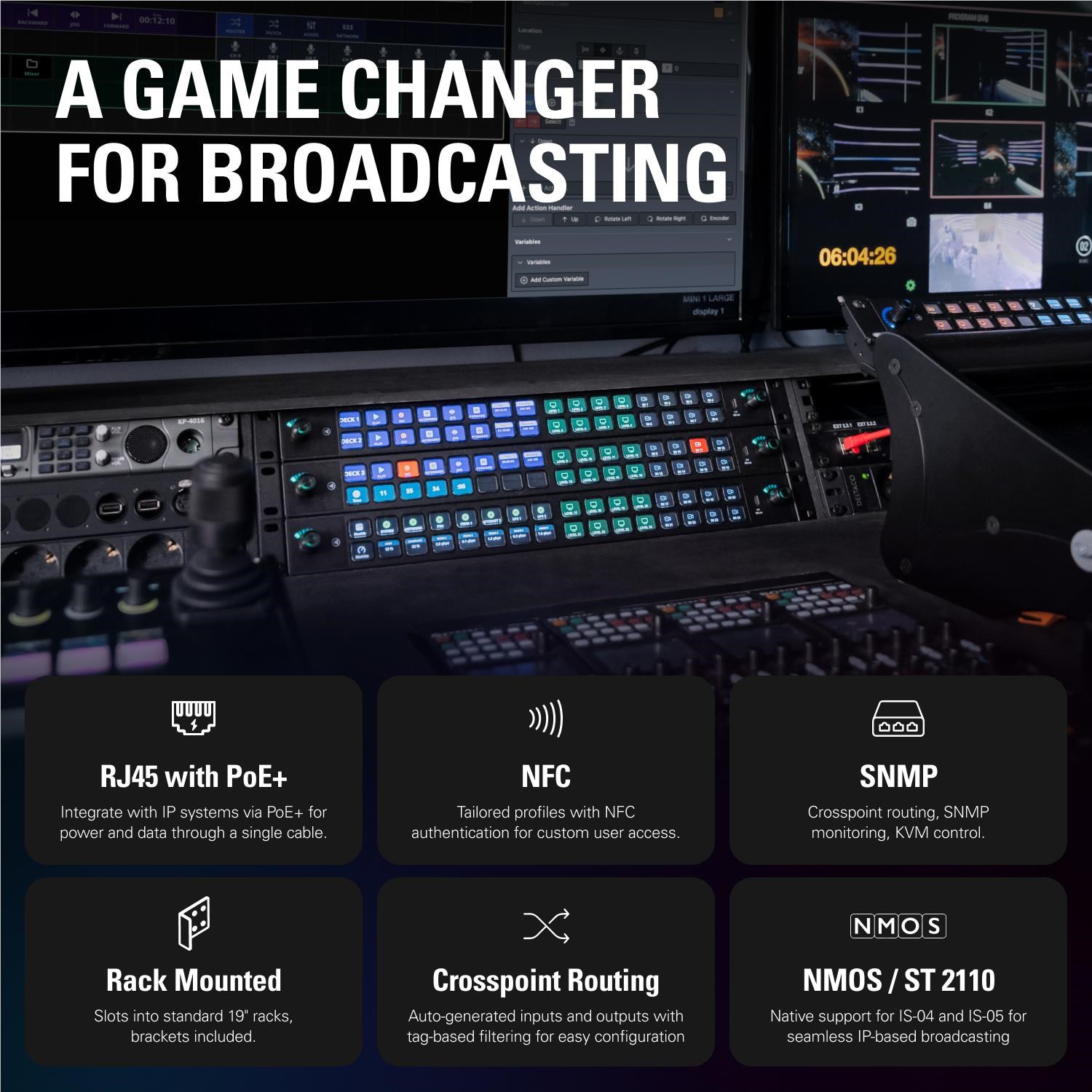 Hyper-customizable and widely compatible. Stream Deck Studio brings modern routing. control. and monitoring capabilities to broadcast infrastructures big and small. Paired with custom Bitfocus Buttons software. setting up and reconfiguring is quick and easy. IP and SDI protocols ensure seamless integration with both legacy equipment and the latest devices. Design workflows your way. navigate complex setups with instant visual feedback. and personalize user access via integrated NFC authentication. Built for professional broadcasting. Stream Deck Studio combines efficiency. versatility. and cutting-edge technology to streamline production workflows like never before.