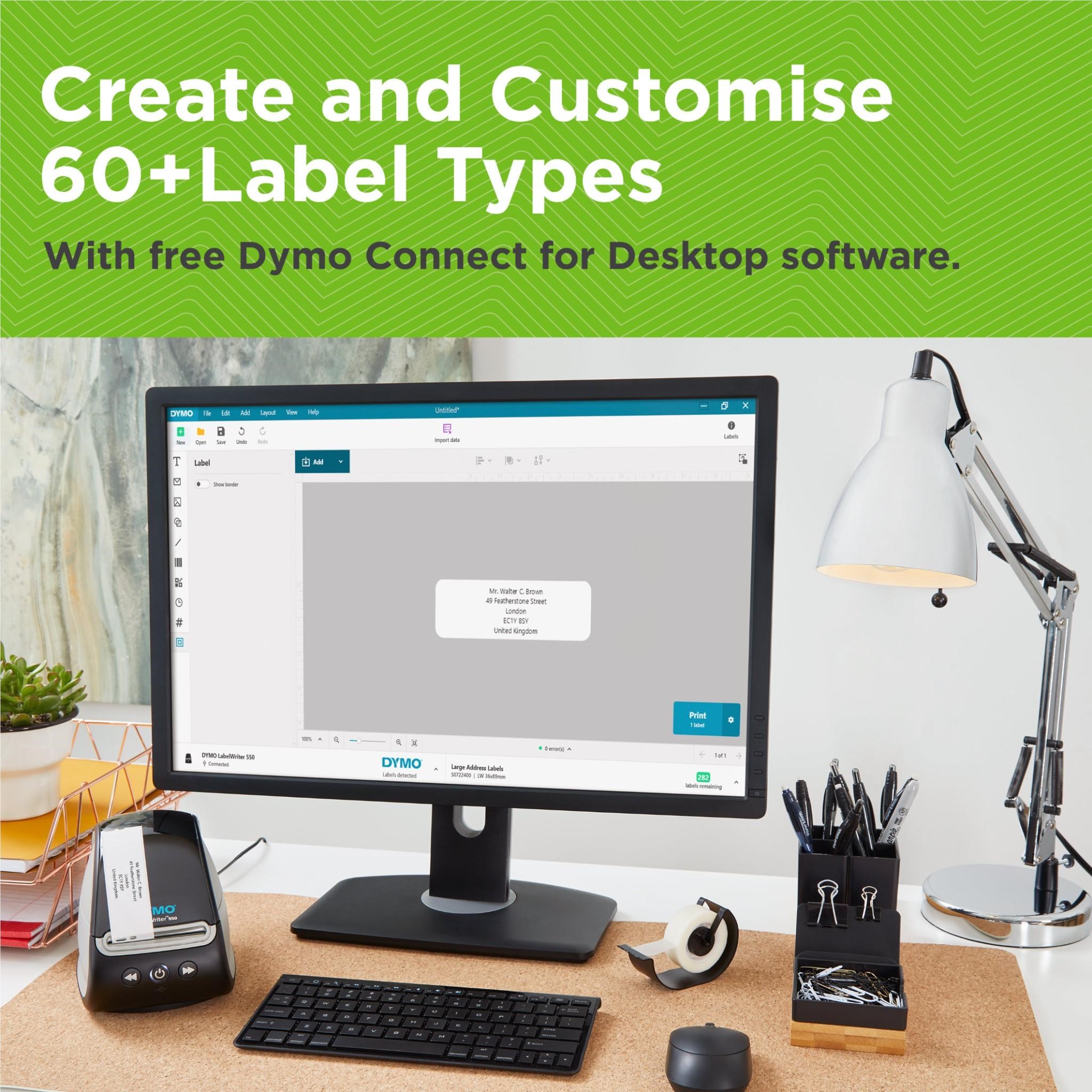 The DYMO® LabelWriter® 550 label printer comes with unique Automatic Label Recognition so you always know the size. type. and number of labels remaining. The direct thermal label printer replaces the need to buy costly ink or toner. while the portable size helps it fit into any modern workspace.