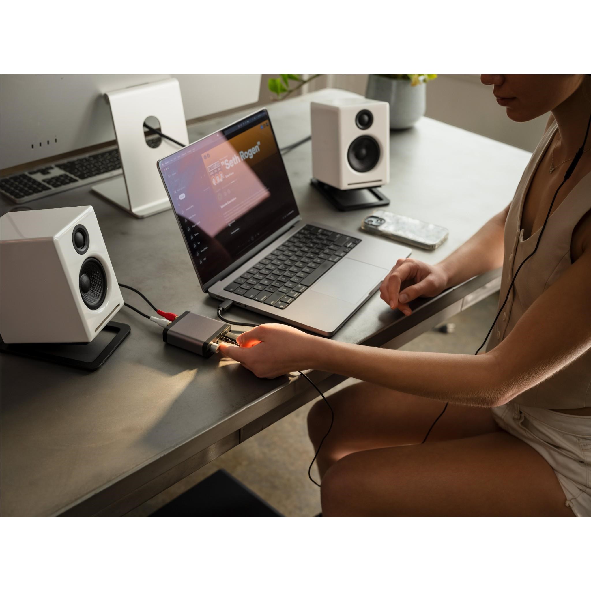 Audioengine values your control over the listening experience. The D1P features an output toggle switch. allowing you to smoothly switch between headphones or speakers. This control lets you fill the room with music or immerse yourself in a private listening session. catering to your preference at on demand.