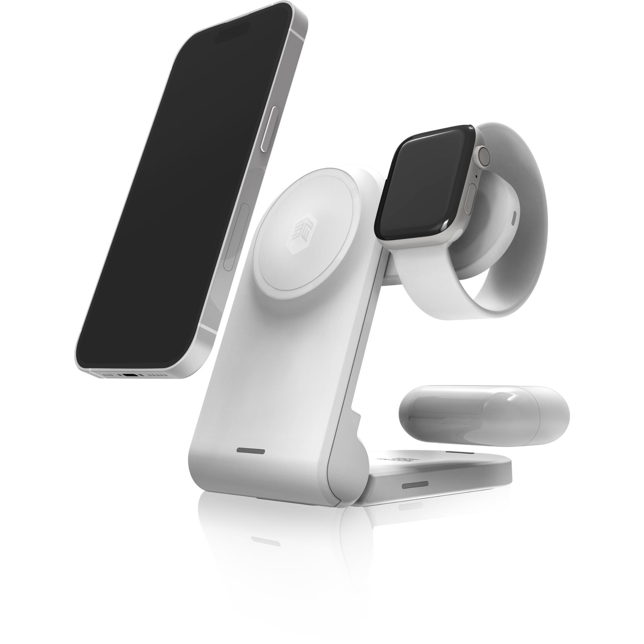 Phone platform works with MagSafe. AirPods charge on the back platform. watch arm swings out to charge the Apple Watch
