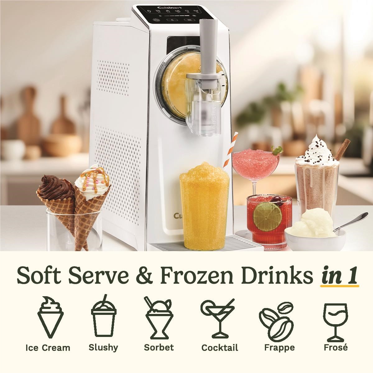 Frozen treats for every mood with the Cuisinart Frost Fusion® 6-in-1 Slushie & Soft-Serve Maker! This all-in-one machine creates soft-serve. slushies. frappés. sorbets. wine slushes. and frozen cocktails in just 20 minutes - no pre-freezing needed.