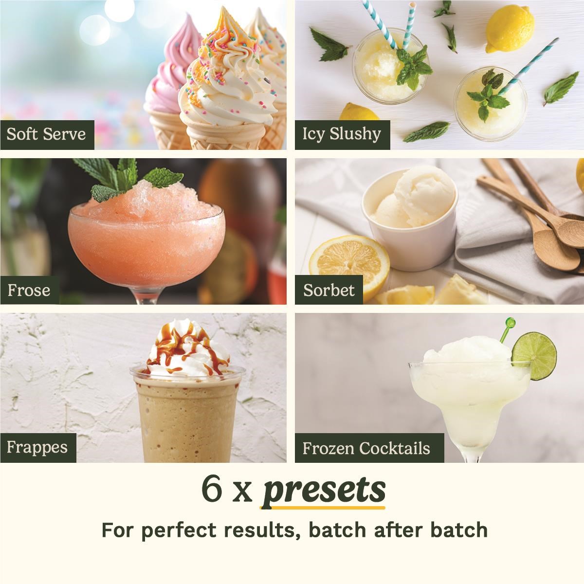 Whether you're craving creamy soft-serve ice cream. refreshing sorbet. icy slushies. smooth frappés. or even frozen cocktails and wine slushies. this 6-in-1 machine does it all