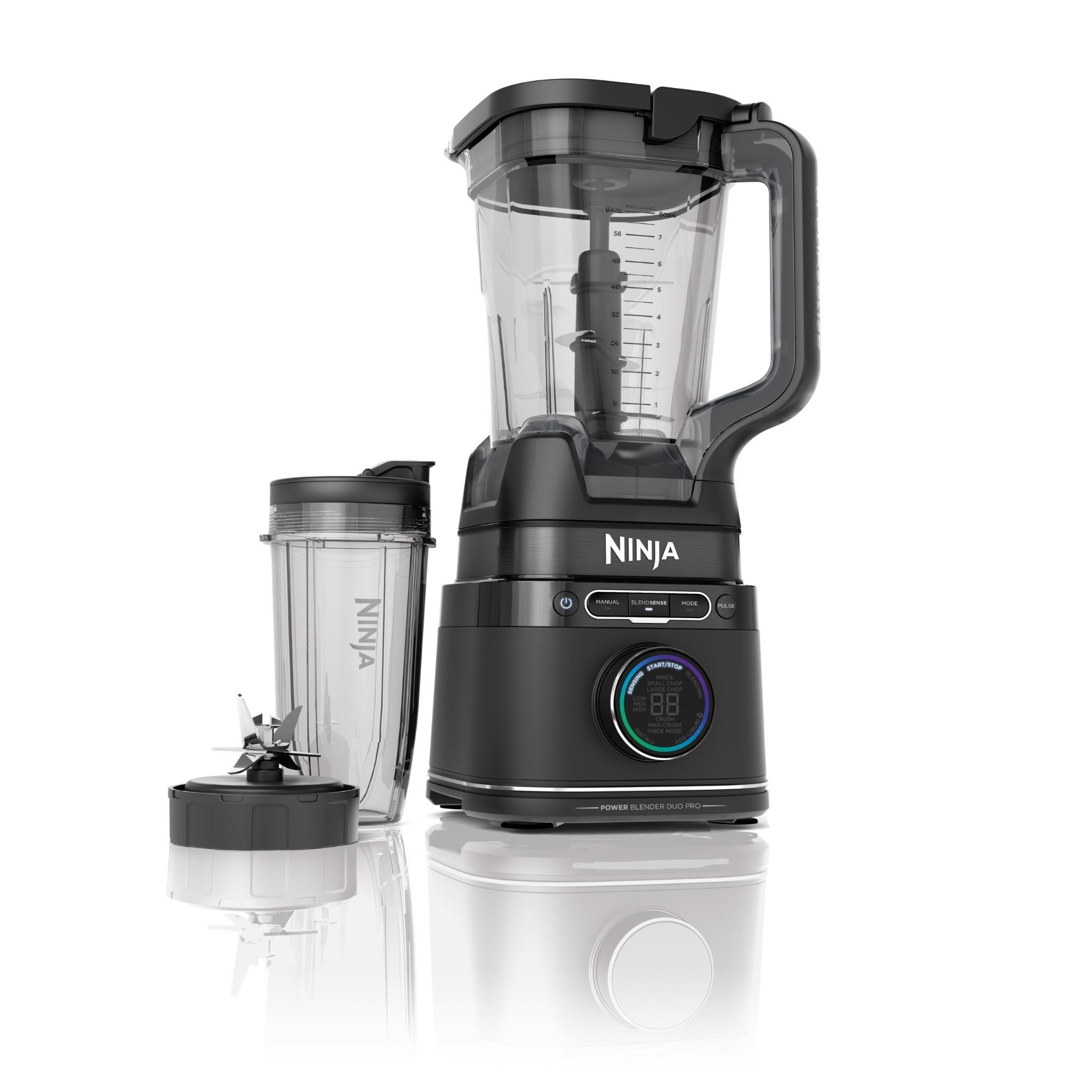 The Ninja Detect Duo® Power Blender Pro with BlendSense Technology allows you to add ingredients. press the dial and watch them blend into a perfectly smooth output. This blender adjusts the power. speed and time needed to make perfect smoothies. shakes. frozen drinks and more in the 2.1L jug or 700ml to-go cups. Includes food processing modes to mince and chop veggies and salsas.