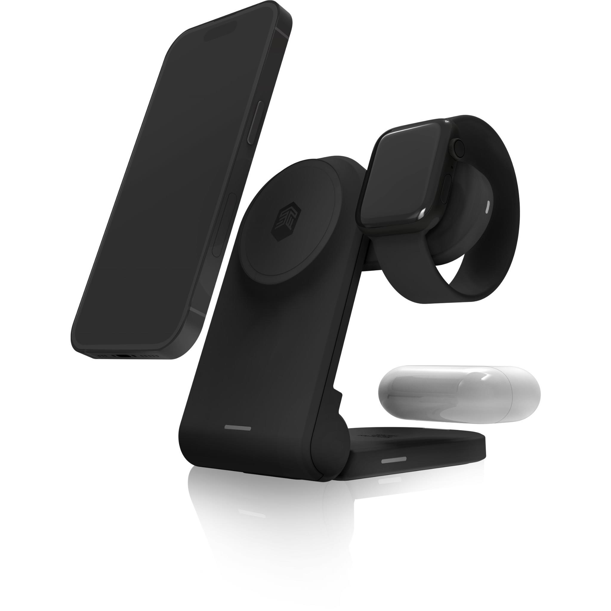 Phone platform works with MagSafe. AirPods charge on the back platform. watch arm swings out to charge the Apple Watch
